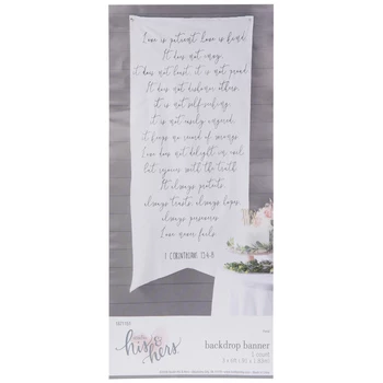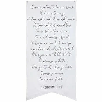 Let faith and promise be the foundation of your marriage. Made of canvas, 1 Corinthians 13:4-8 Backdrop Banner features a long pennant shape in an off-white color with the timeless verses from 1 Corinthians printed across the front in elegant black calligraphy. Complete with metal grommets in each of the top corners, display it along a wall to give your ceremony or reception a touch of grace and unwavering trust.