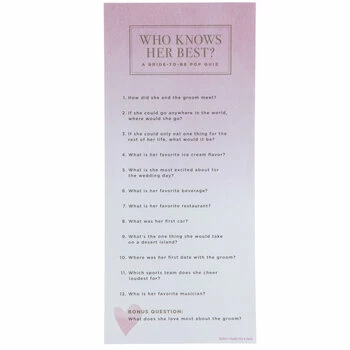 Quiz your friends on how they really know you before your special day! Bridal Shower Quiz is a fun game that all your gal pals will be happy to play. On ombre pink paper with hearts in one corner, each sheet offers up a list of thirteen questions that range from where you met your soon-to-be spouse and what your favorite ice cream flavor is to your first car. Pass them around with pens to quiz your friends, and make a fun prize for the winner!