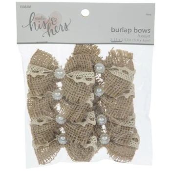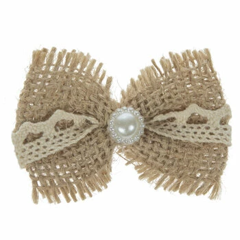 Incorporate a beautiful and rustic theme in your wedding with Burlap & Lace Pearl Bows! These darling little bows are made of burlap with strips of crocheted lace running horizontally and plastic pearls in the center. Use them as simple table decorations, embellishments for paper crafts, or add them to larger decor pieces!