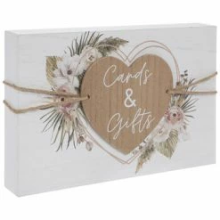 Decorate your wedding venue with charming accents like this Cards & Gifts Heart Wood Decor! The MDF decor is white with a pastel flower and leaf design and a pink heart outline. Jute string and a brown MDF heart cutout with “Cards & Gifts” written in white text are layered on top. Place this adorable sign on a table dedicated to collecting gifts meant to celebrate your marriage!