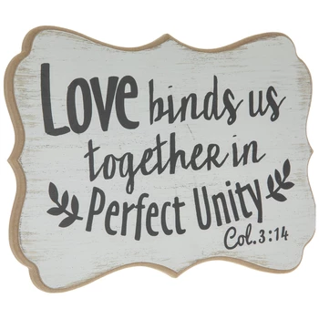 Accent your ceremony or reception withΒ Colossians 3:14 Wood Decor. This beautiful decor features an MDF construction with a quatrefoil shape, a brushed white finish, and a Bible reference in black lettering. Add it to a table or counter for lots of dashing wedding style!