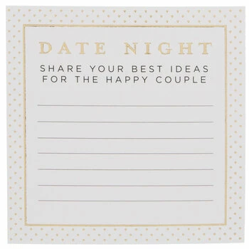 Let the guests at your wedding take part in a time-honored tradition of passing on their wisdom! Simply set out Date Night Advice Cards on a table with some nice pens and watch them get to work. These paper cards have a solid white color with metallic gold trim and ruled lines. Everybody knows it’s important to keep the passion alive, so build a catalog of great ideas for date night to make your marriage a happy one!
