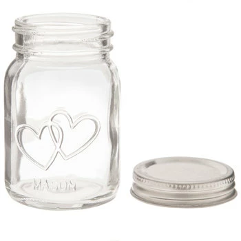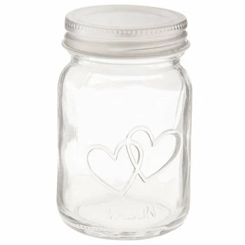 Create a variety of darling wedding favors with the help of Double Heart Glass Mason Jars! These lovely jars are made of clear glass and accented with double heart designs and silver metal lids. Transform them into fun party favors to fit any wedding theme!