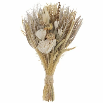 Dried Flowers & Palm Leaves Bouquet will add a lovely touch to your wedding decor. This bouquet features white foam roses, yellow foam daisies, and dried grain and grass stems. A large paper palm leaf rests at the back of the bouquet, adding a textural contrast. Use this bouquet as a centerpiece, chair accessory, and more!