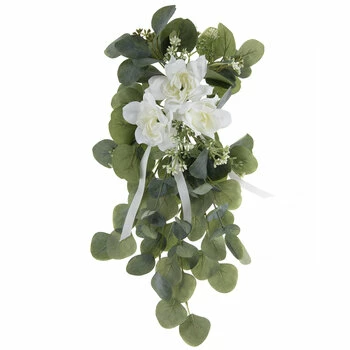 Design your wedding to perfection! Eucalyptus & Gardenia Teardrop is a beautiful addition to your decor. It is designed in a teardrop, hanging styleΒ with delicate faux eucalyptus leaves making up the bulk of this arrangement. White gardenias are tucked into the top and embellished with small white buds. It also includes a white ribbon so you can display itΒ on church pews, your wall, and more!