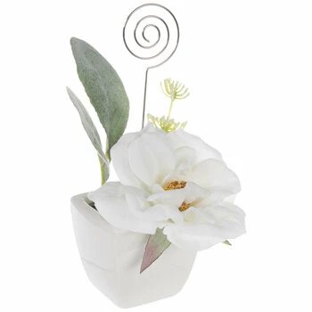 Mark place settings with fun photos or messages on Flower Pot Place Card Holder! This lovely holder offers a shiny white square flower pot adorned with a white fabric flower, green embellishments, and a metal swirl clip sticking out on top for holding your place card. Set the tables at your wedding with a lovely floral creation!