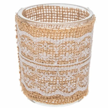 Illuminate special, rustic events and let your style shine with Glass Candle Holders With Burlap & Lace. These beautiful, cylindrical containers are made of glass and feature a plain, clear color with a piece of burlap wrapped around the exterior adorned in white lace. Perfect for holding a tea light or votive candle. set them out as part of a centerpiece at bridal showers, ceremonies, and receptions!
