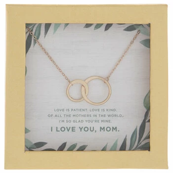 Give a gift of thanks! Gold Mother Of The Bride Loop Necklace is a gold chain necklace that is joined together by a clasp. The front features two flat metal loops that are connected to each other, to represent the bond between you and your mother. This is the perfect sentimental gift!
