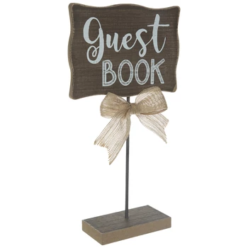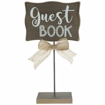 Let your guests know exactly where they can provide their autograph! Guest Book Wood Decor is an adorable table piece with a lightly distressed wood look made of MDF, cream text, and a burlap ribbon accent. Set it out on a table to direct guests in the right direction!
