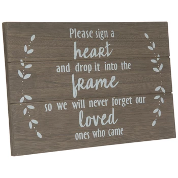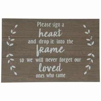 Never forget all the little things that made your wedding day so special! Heart Drop Wood Decor is a great way to remember the day and all the loved ones who came to celebrate your marriage. This MDF sign is a small rectangle with a plank-look, boasting a dark brown color with white text and laurel leaf designs to the side.