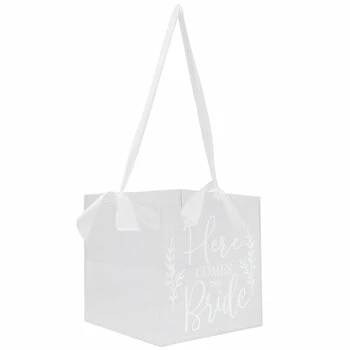 Use this lovely Here Comes The Bride Flower Basket to elevate your wedding ceremony! The clear acrylic box has an open top and a white silk ribbon as the handle. On the front of the box, “Here Comes The Bride” is written in lovely white text. Place gorgeous flowers in the basket for a darling display just before the bride’s big entrance!