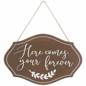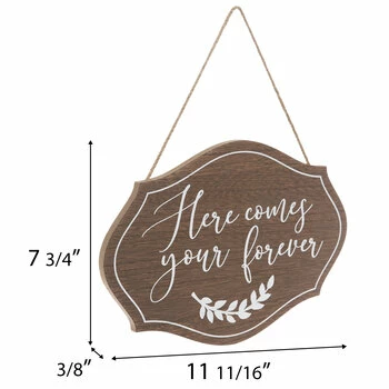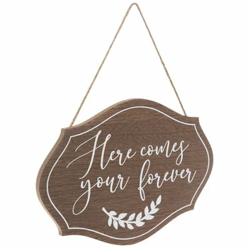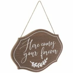 Use this darling Here Comes Your Forever Wood Wall Decor to elevate your wedding ceremony! The brown MDF decor has scalloped edges with a white border and a matching leaf design and text. “Here Comes Your Forever” is written at the center. Hang this wall decor in your wedding venue or give it to a bridesmaid to walk down the aisle just before the bride’s big entrance!