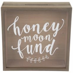 Prepare for your special trip with Honeymoon Fund Wood Coin Bank! This square MDF brown wood bank features a clear acrylic panel on the front so you can see the progress of your funds accumulating. The front of this panel features white, curisve text and a small branch design.