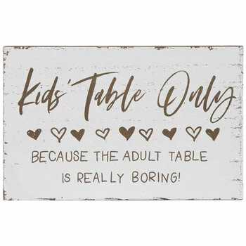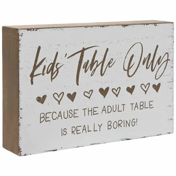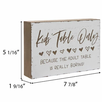 Decorate your wedding venue with playful accents like this Kids’ Table Only Wood Decor. The MDF decor has a light brown border, a white distressed background, and a playful quote written in brown text. Place the sign in the middle of the kids’ table to make them feel special while celebrating your marriage!
