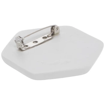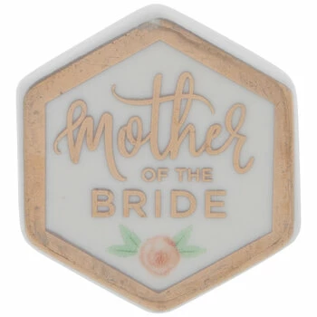 Identify the family! Mother Of The Bride Hexagon Pin is made from ceramic in a thin hexagon shape. This glossy white piece has a metallic gold border and text with a little design of green leaves with a pink rose in the center. Use the metal pin on the back to secure it to the mother’s outfit on the big day.