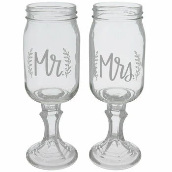 Add a touch of flair to your big day with these unique Mr & Mrs Mason Jar Toasting Glasses! These clear mason jar glasses feature a sturdy, round faceted base, a small neck, a round jar shape, and the words “Mr” and “Mrs” between two leaves on each glass. This matching pair will make your wedding day even more beautiful and memorable.