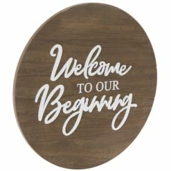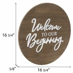 Greet your guests with simple accents like Our Beginning Wood Wall Decor. This MDF piece has a round shape with a natural-colored background and white lettering in the center. Hang it near the entrance of your venue to welcome all to your big day!