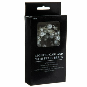 Bring light into your celebrations with Pearl Beaded Lights. This gorgeous garland features ivory faux pearls, silver colored wire, and warm white LEDs. It is battery operated, so you can use it in virtually any reception or ceremony decoration. Light up your special day!