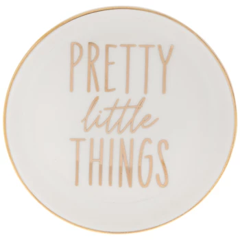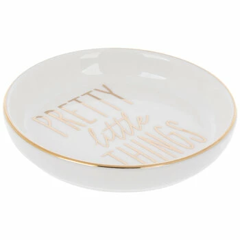 Add a pop of sweetness to your table top or counter with Pretty Little Things Jewelry Dish! Made of ceramic, this charming dish offers a white glazed finish, a metallic gold edge, and metallic gold text that reads “pretty little things”. It’s perfect for a bedroom side table or a bathroom counter!