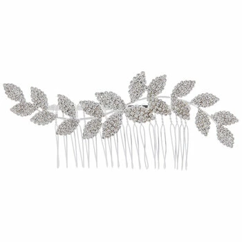 Get the perfect accessory for the big day! Silver Rhinestone Leaves Hair Comb features a small silver metal comb base that is set with a curved branch of pointed leaves that are made up silver faceted rhinestones. This beautiful accent can anchor into an updo for the wedding or any other special occasion.