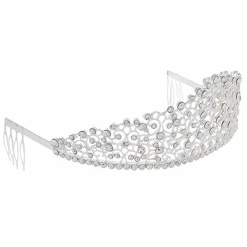Top off your wedding day ensemble with a tiara fit for a princess! Silver Rhinestone Metal Tiara features a silver metal swirl design that is fit with many round, clear faceted rhinestones. The silver band also has two sets of combs to help secure it to your hair!