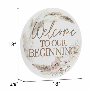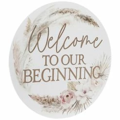 Create a dreamy greeting for your special day with this Welcome To Our Beginning Wood Wall Decor. The circular decor has a printed white grain background with a gorgeous design of pastel pink and green flowers and leaves. “Welcome To Our Wedding” is carved into the center of the piece. Hang this lovely wall decor for all of your guests to see as they arrive to celebrate your marriage!