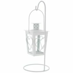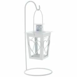 Illuminate your special day with sweet accents like White Heart Metal Lantern. This metal piece offers a white hook stand which holds the white metal lantern. The lantern itself offers clear glass panels embellished by white heart outlines. Pair it with an LED candle to bring a romantic glow to your ceremony!