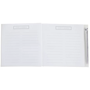 Get married, and take names with White & Silver Guest Book & Pen! Featuring a silver foil design on the cover and a silver pen with a built in holder, this book is perfect for placing at your wedding or reception to gather a list of those who came to celebrate your special day. With a place for names and addresses, you can be sure to thank all of the guests who came to celebrate your big day!