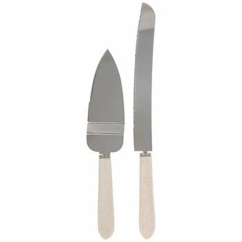 Time and love went into the preparation of your precious wedding cake, so pair the right set with it to serve it in style! Wood Grain Cake Server & Knife features a long, serrated knife and a slightly rounded and serrated cake server with whitewash wood grain handles and stainless steel bodies. With a rustic wedding theme, add the right elements to the reception to make it a magical and memorable day!